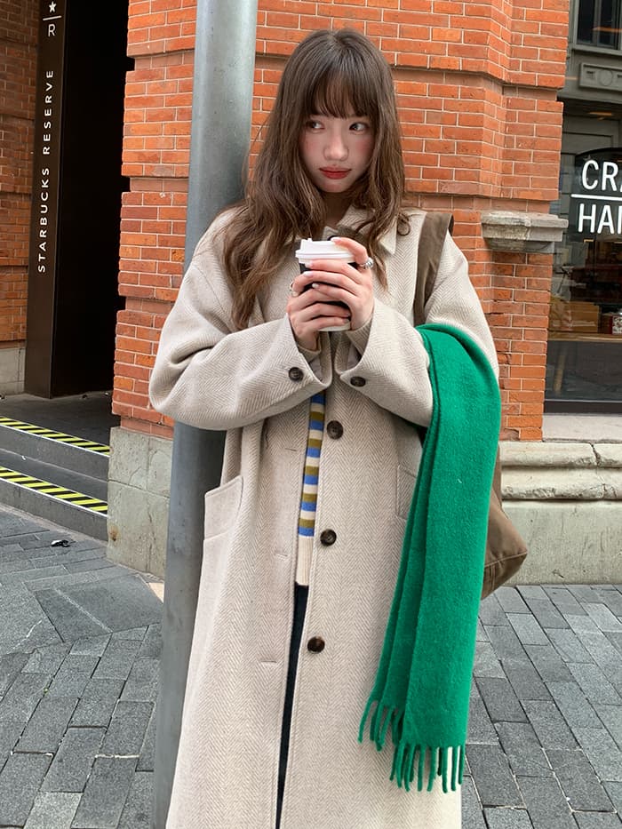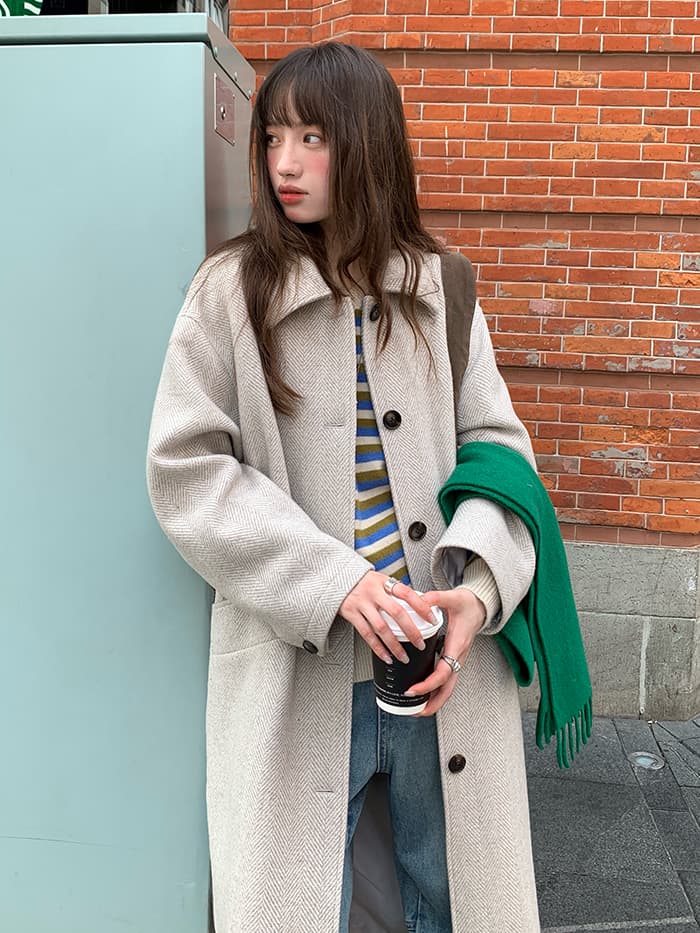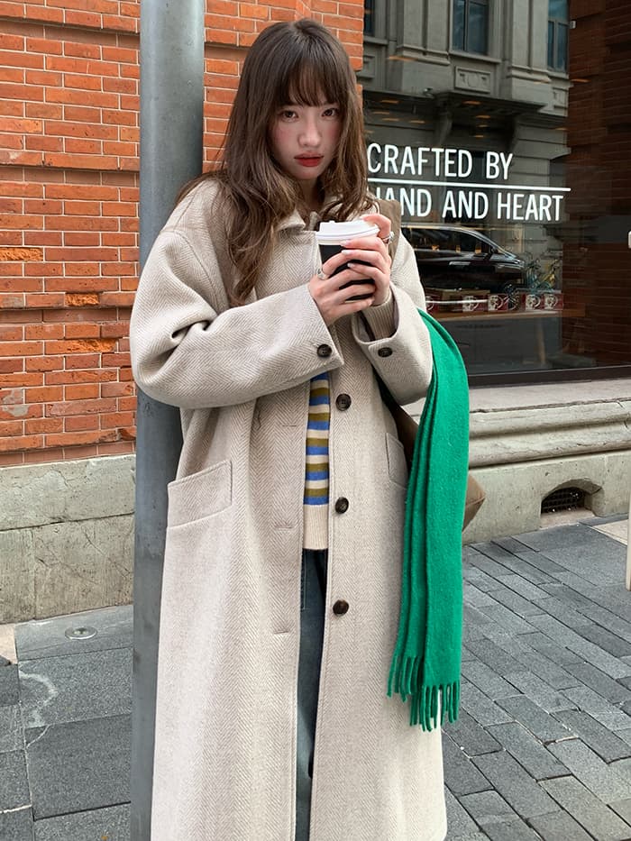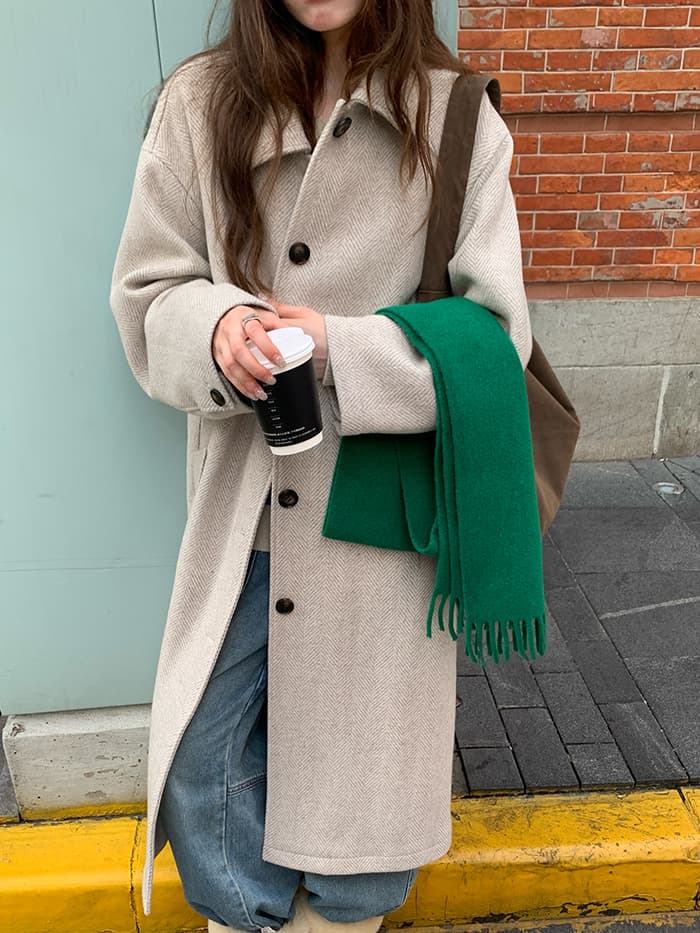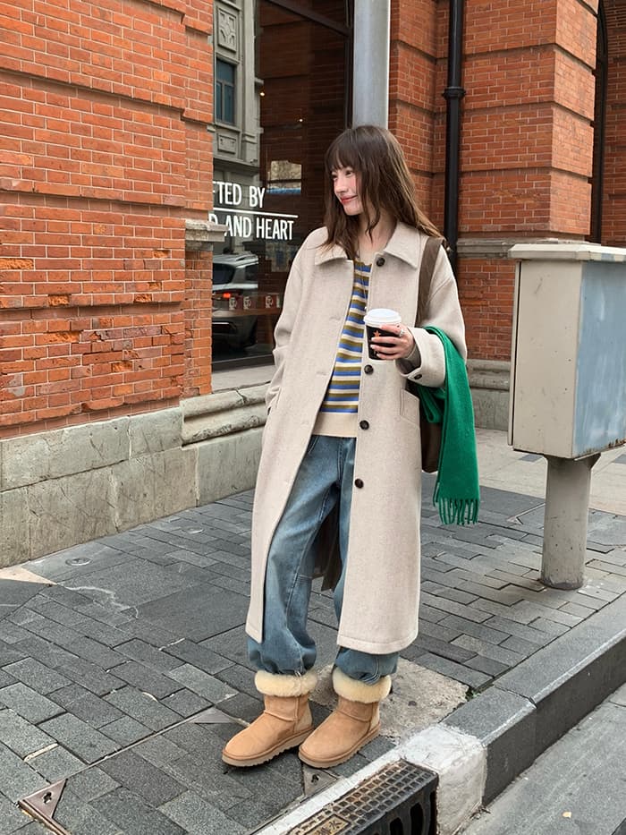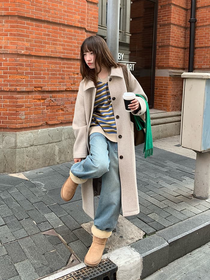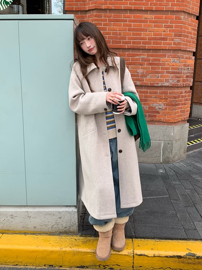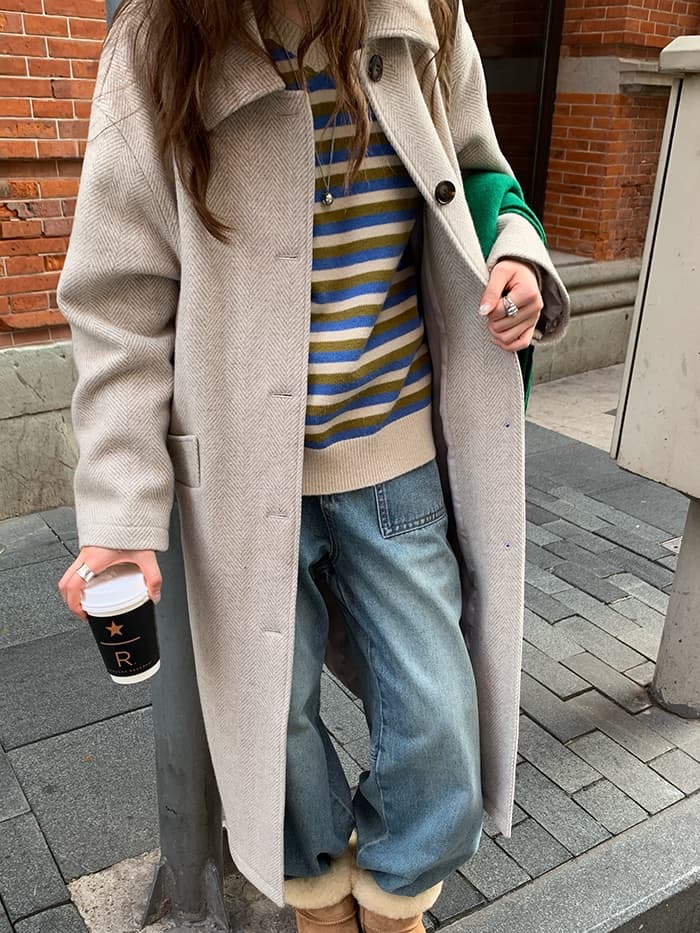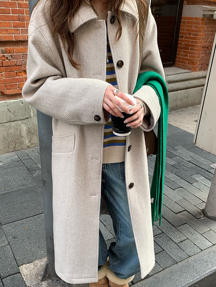前立ての一列ボタンがミニマルな印象を与え、どんなコーデにも馴染みやすい。袖口にもボタン付きでディテールも抜かりなし。