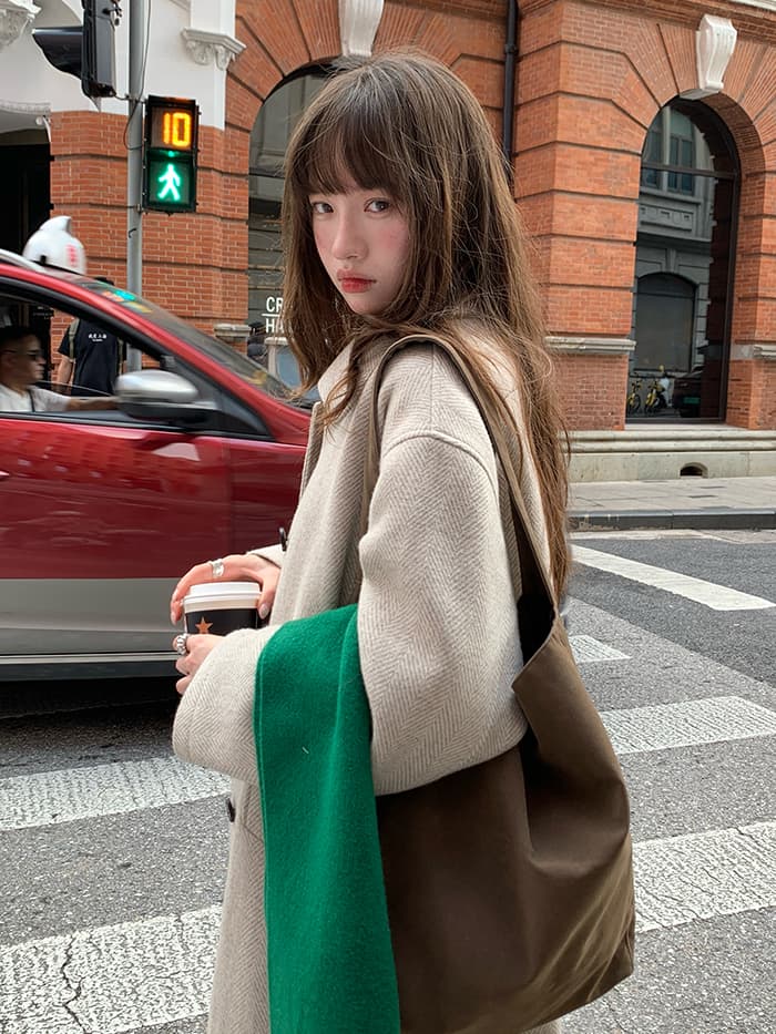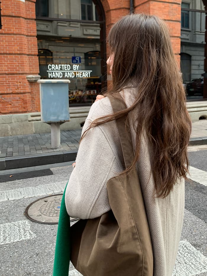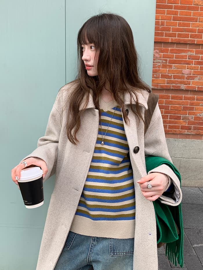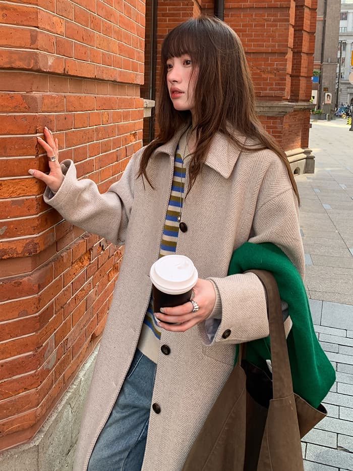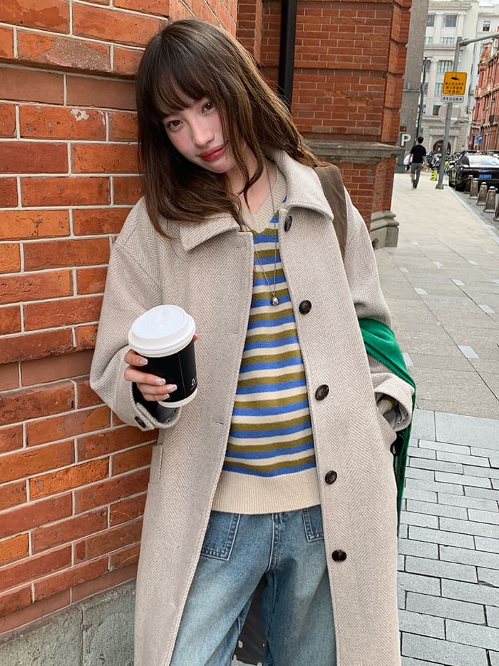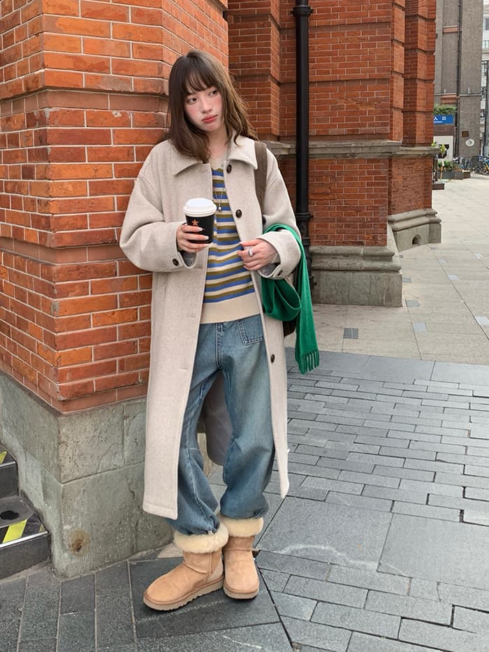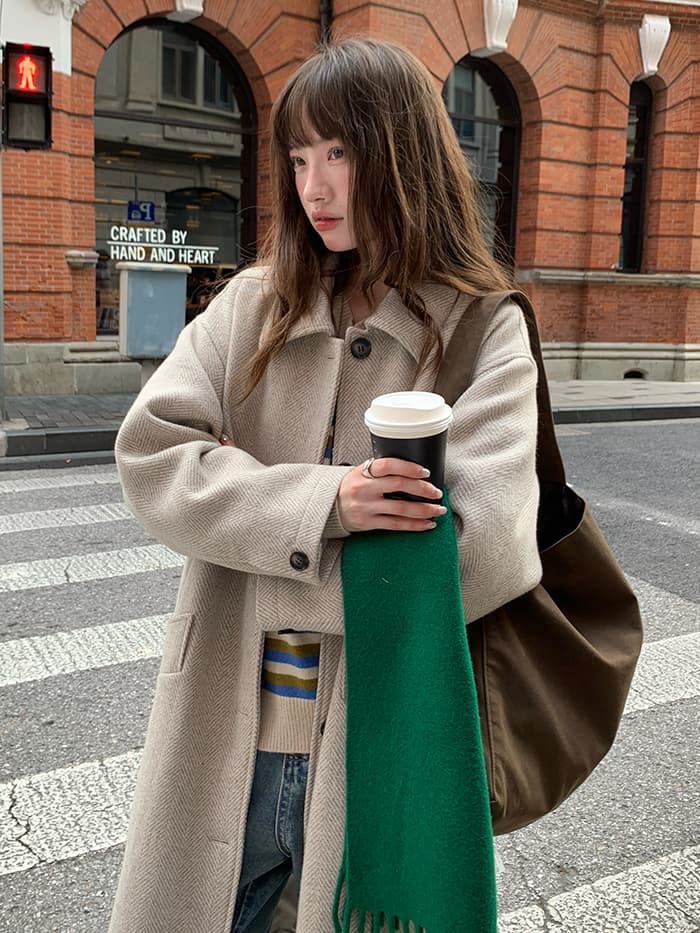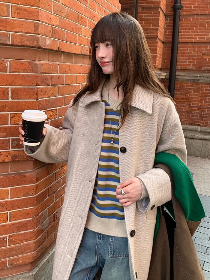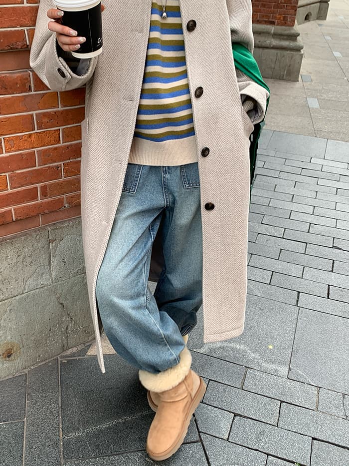 前立ての一列ボタンがミニマルな印象を与え、どんなコーデにも馴染みやすい。袖口にもボタン付きでディテールも抜かりなし。