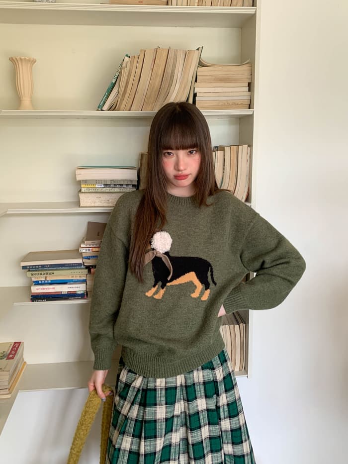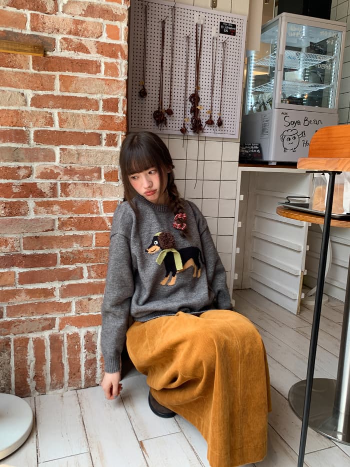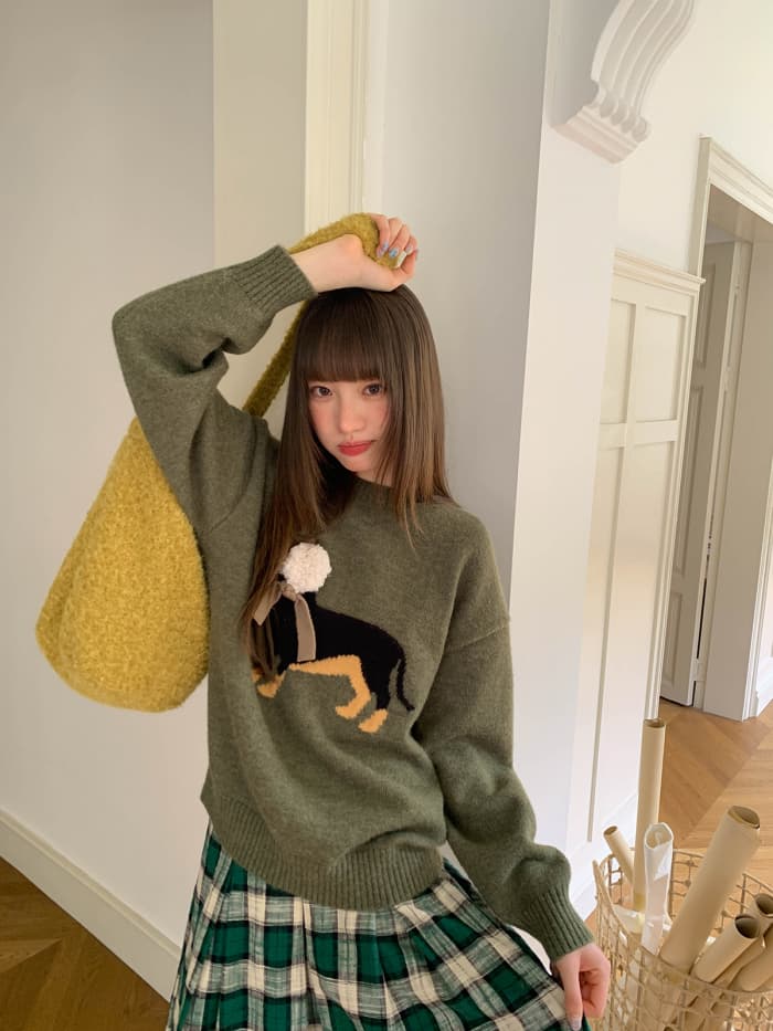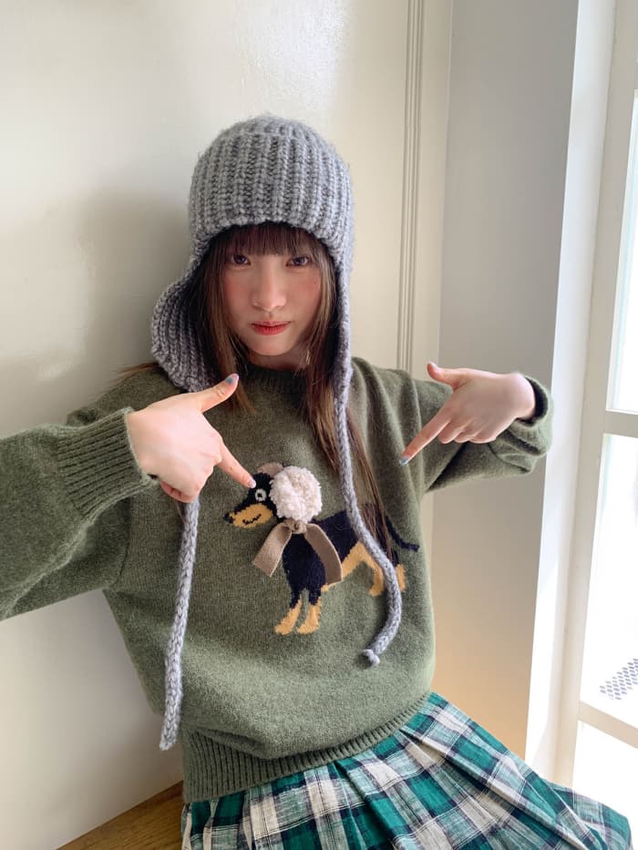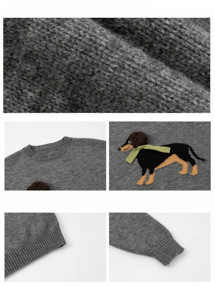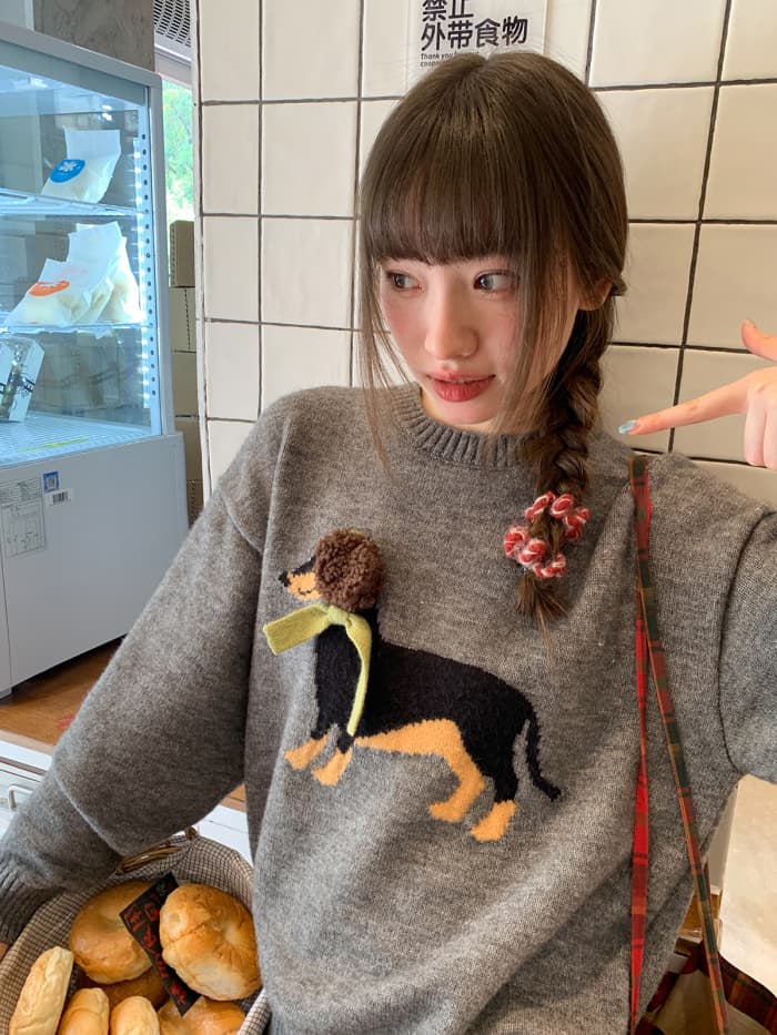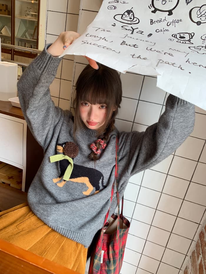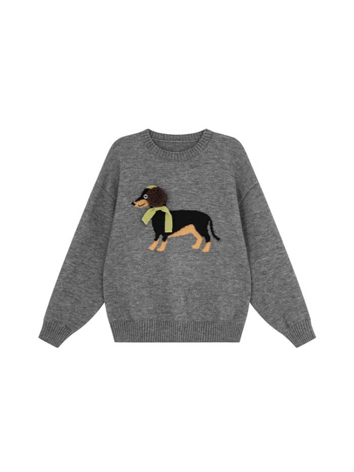 ふんわりとした風合いのニットに、立体的なダックスフンドジャカードがポイント。