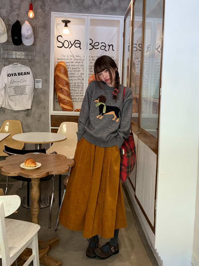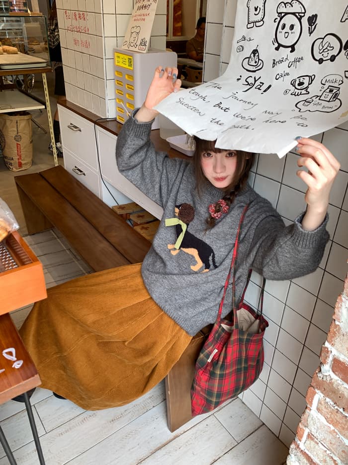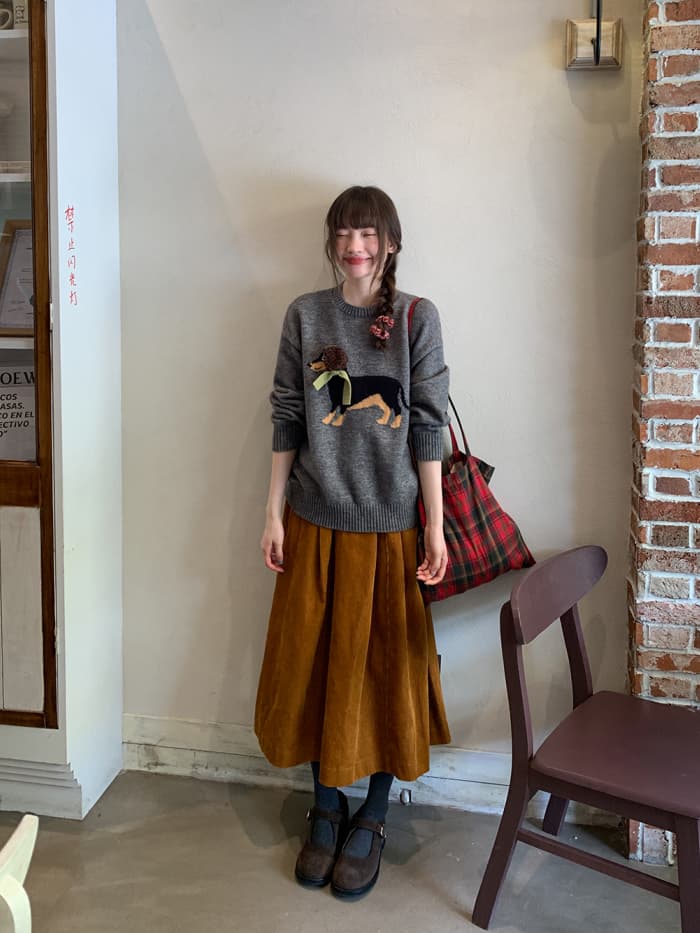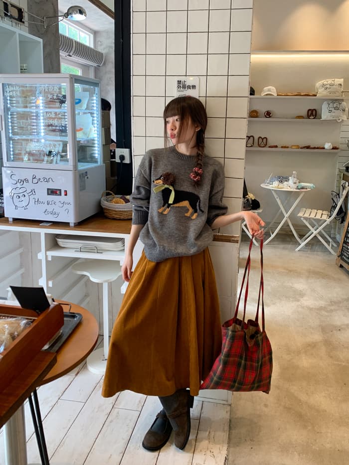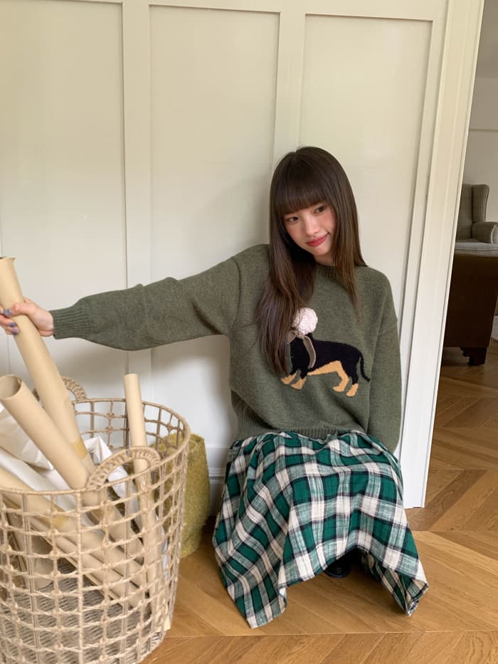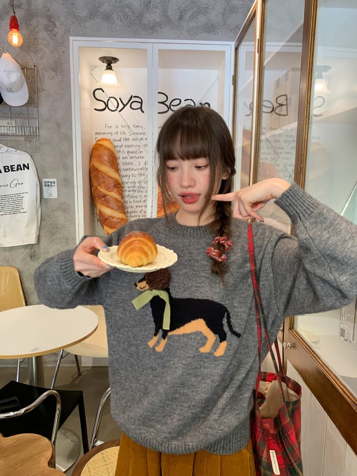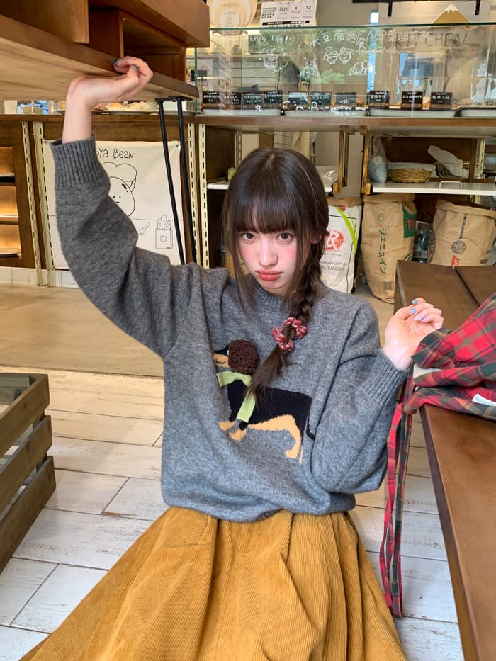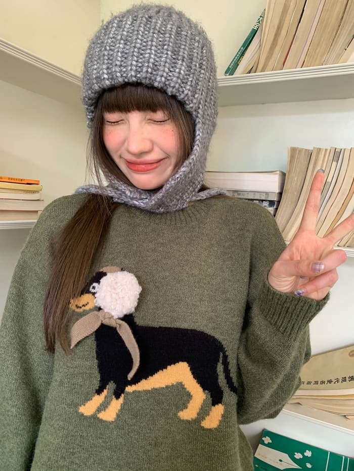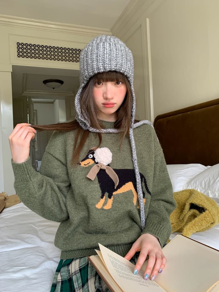ふんわりとした風合いのニットに、立体的なダックスフンドジャカードがポイント。