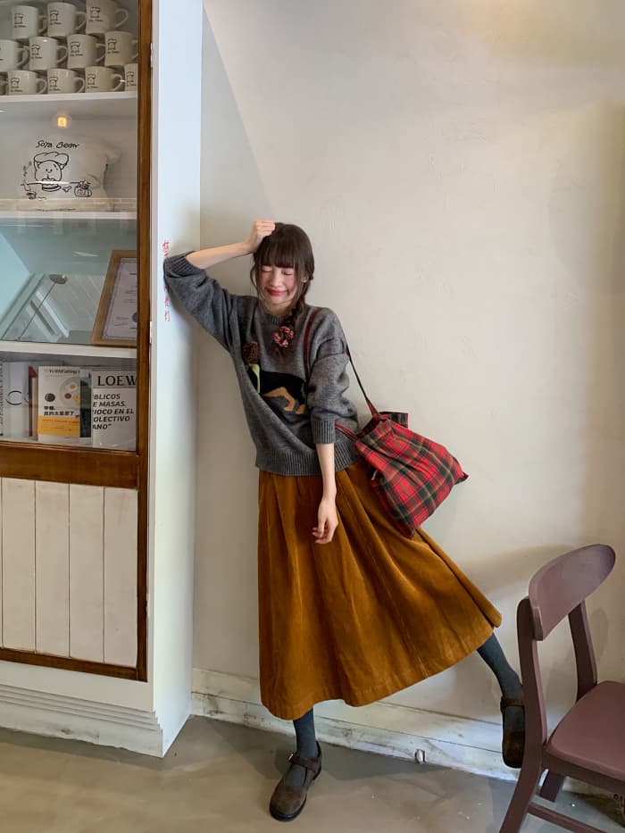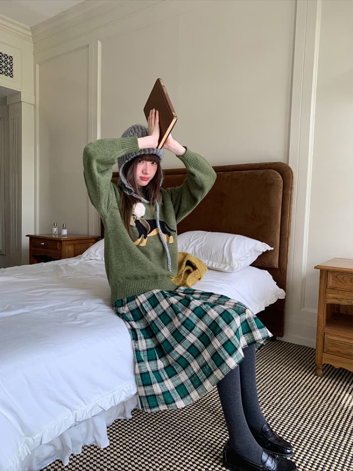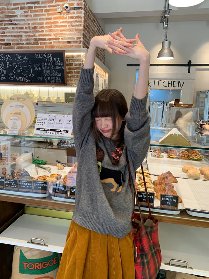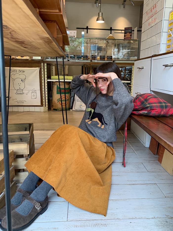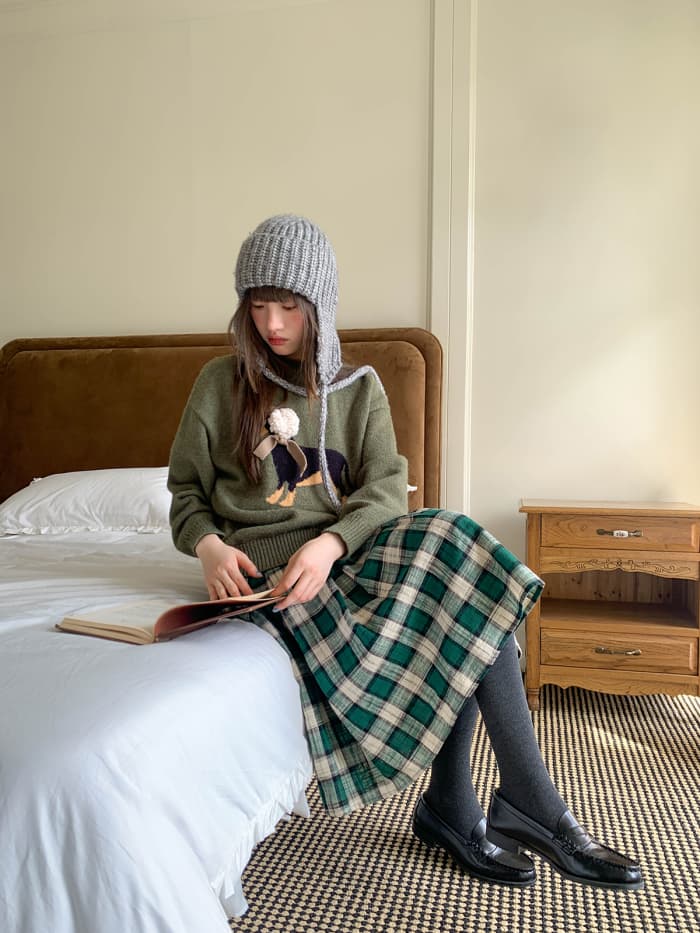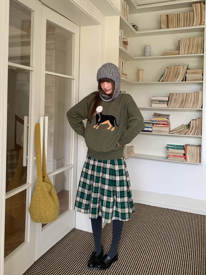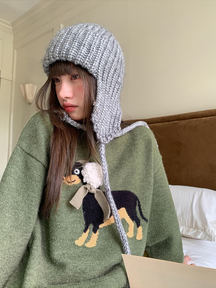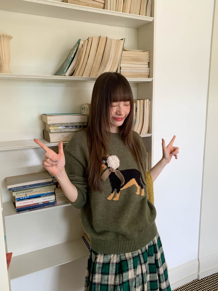 ふんわりとした風合いのニットに、立体的なダックスフンドジャカードがポイント。